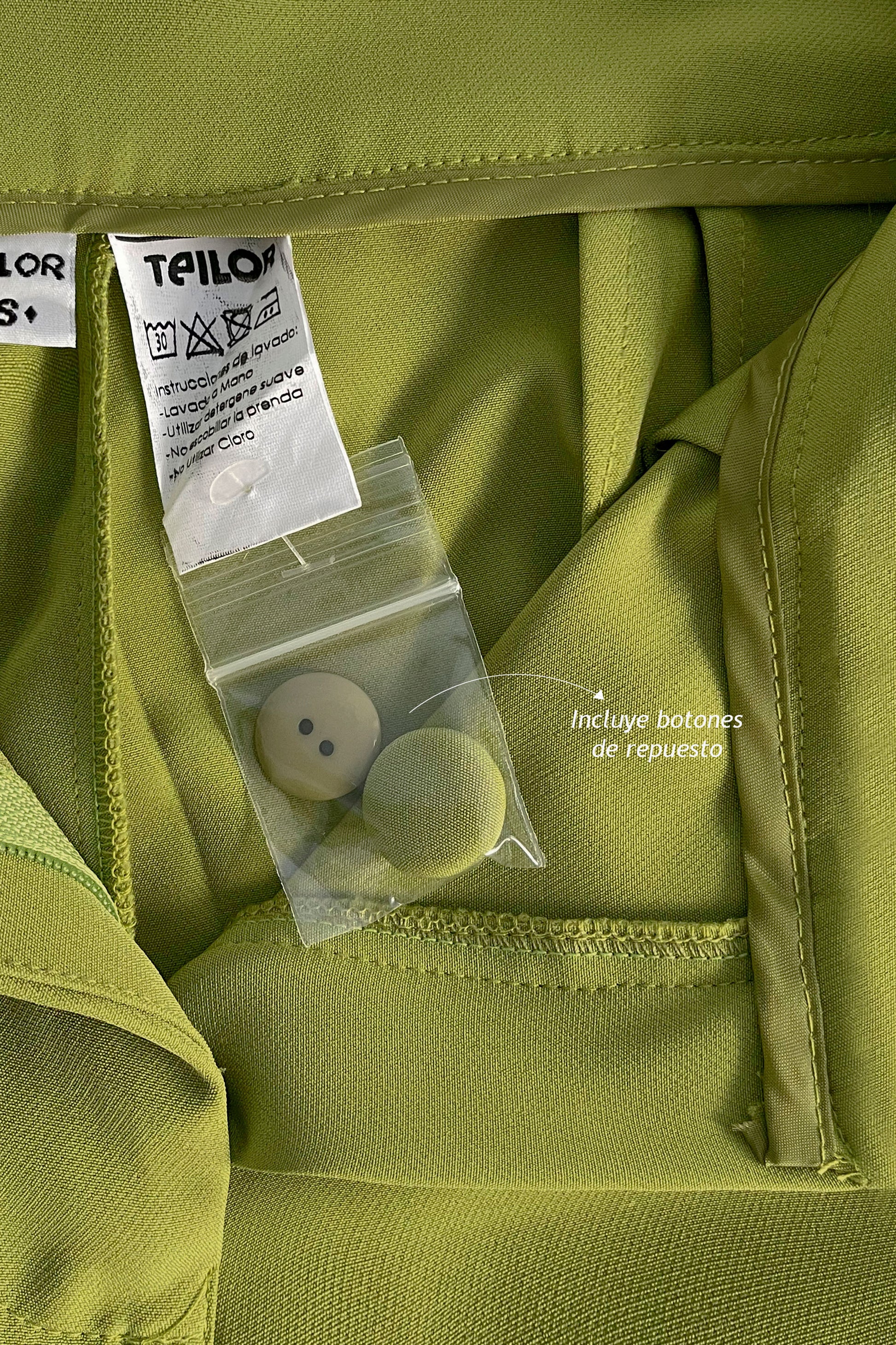 - Posee un botón forrado de la misma tela con el detalle de presillas.